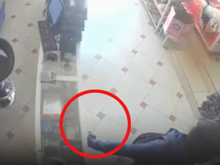 En el video se observa primero ingresar a una persona cubierta la cabeza con un caso de motocicleta que pide un jugo de botella. Mientras la vendedora le atiende, el sujeto le hace señas con su mano al otro individuo. La imagen muestra que el asaltante con la mano extendida le indica el número de personas que hay en el interior.